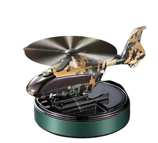 Виготовлений із високоякісних матеріалів, цей вертоліт-ароматизатор відрізняється ретельно опрацьованими деталями, що роблять його максимально реалістичним. Його елегантні сонячні панелі не тільки надають футуристичного вигляду, але й виконують практичну функцію, забезпечуючи обертання пропелерів під впливом сонячного світла або штучного освітлення. Легкий рух лопатей сприяє ефективному поширенню аромату, створюючи неповторну атмосферу довкола.