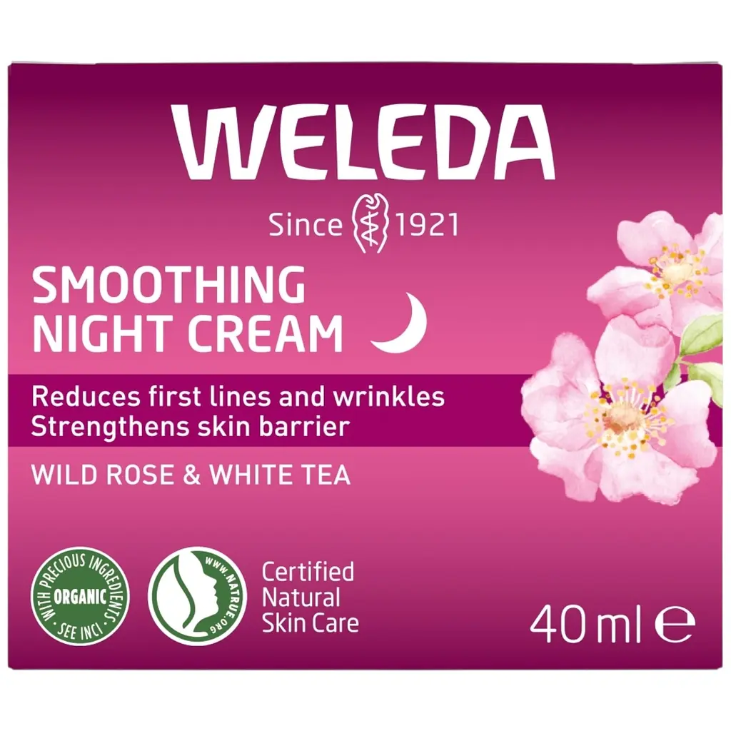 Weleda Smoothing Night Cream з дикою трояндою та білим чаєм – це нічний крем, який працює на відновлення та зміцнення шкірного бар'єра, зменшуючи перші зморшки та усуваючи напругу на обличчі. Його багатофункціональна формула з органічним комплексом Age Protect Complex активно живить шкіру, забезпечуючи їй регенерацію під час сну. Крем з органічною олією дикої троянди та екстрактом білого чаю сповільнює процес старіння, покращує колір обличчя і підтримує баланс вологи в шкірі.