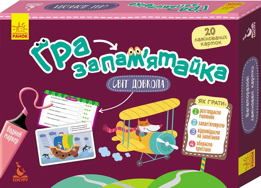 Чарівна "Гра-запам'ятайка" допоможе:- розвинути пізнавальні здібності і пам'ять;- розвинути логічне та асоціативне мислення;- придбати мовні навички;- удосконалити навички рахунку.Крім того, ящичок надасть вашій дитині можливості багаторазово тренуватися і з кожним разом робити все менше помилок!Набір складається: 20 карток, одностороння ламінація, 17х11 см.