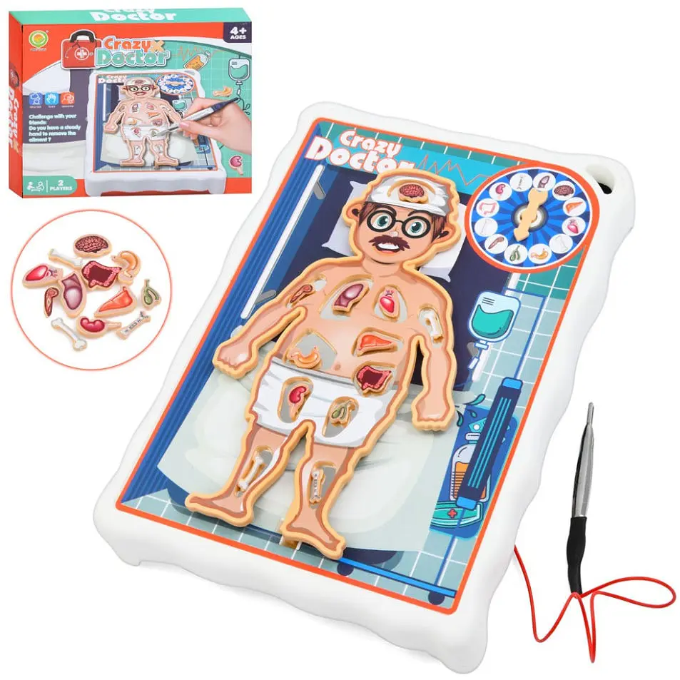 Цей захоплюючий набір перетворить дитину на справжнього лікаря! Гра поєднує в собі елементи навчання та розваги: малюкові потрібно за допомогою пінцета обережно витягати різні частини тіла з ігрового поля, не зачепивши краї. Це чудовий тренажер для дрібної моторики та концентрації уваги.