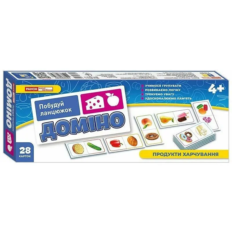 Доміно "Продукти харчування" - навчально-розвивальна гра для дітей віком від 4 років. У набір входить 28 міцних карток із яскравими зображеннями та простими правилами гри, що надруковані на упаковці. Кількість гравців: 2-4. Гра сприяє формуванню навичок класифікації: діти вчаться розрізняти продукти за групами - молочні, м’ясні, овочі, фрукти, солодощі, гарніри, хлібобулочні вироби. Кожна група має свою кольорову рамку - це зручно та наочно. Доміно розвиває логічне мислення, увагу, пам’ять, навички спілкування та взаємодії. Чудово підходить для індивідуальної або групової роботи. Рекомендовано для використання у дитячих садках, початковій школі, на заняттях з логопедом та вдома. ПРАВИЛА гри Якщо грають двоє гравців, роздаємо по 7 фішок, якщо троє або четверо - по 5. Решту фішок кладемо збоку зображеннями донизу (це "базар"). Гру починає гравець, у якого є фішка з двома зображеннями продуктів, які належать до однієї групи (це "дубль") ПІДКАЗКА: продукти харчування однієї групи зображені з рамочкою однакового кольору. Далі хід передається за годинниковою стрілкою. Гравці по черзі прикладають свою фішку до фішки попереднього гравця так, щоб на полях обох фішок були зображені продукти однієї групи. Наприклад: сметану прикладаємо до кефіру - це молочні продукти, буряк до кабачка За свій хід гравець може викласти тільки одну фішку. Якщо зображення на фішках гравця не відповідає жодному зображенню фішок у викладеному ланцюжку, гравець бере по одній фішці з "базару", поки не знайде потрібну. Якщо фішок у "базарі" немає, гравець пропускає хід і чекає наступного. Виграє той, хто першим викладе всі свої фішки доміно. Обов’язково хваліть дитину за кожен правильний хід.