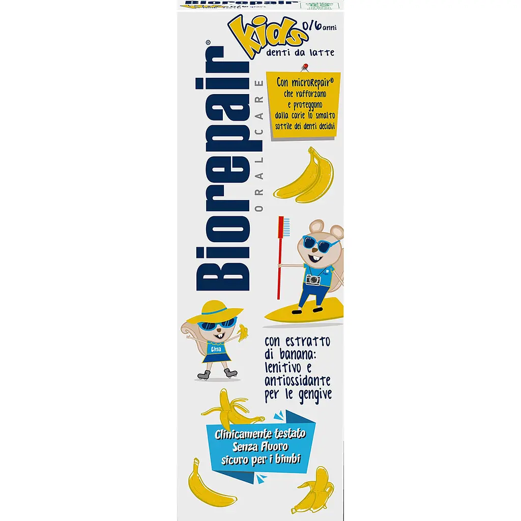 Дитяча зубна паста Biorepair Веселе мишеня Банан - це єдина зубна паста з microRepair 15% (рідка емаль), яка зміцнює, ремінералізує та захищає дитячі зубки та при цьому не містить фтору. Абсолютно безпечна екстра-м'яка формула пасти, в якій враховані всі фізіологічні особливості дитячої порожнини рота. Ідеально підходить для щоденного догляду за дитячою порожниною рота, починаючи з першого зубчика. Паста містить банан, який є гіпоалергенним фруктом з великою кількістю вітамінів, макроелементів і мікроелементів. Має напрочуд приємний смак, що стимулює дитину до регулярного чищення зубів. Дитяча зубна паста Biorepair "Веселе мишеня" банан абсолютно безпечна при ковтанні та може використовуватися з появи першого зубчика.