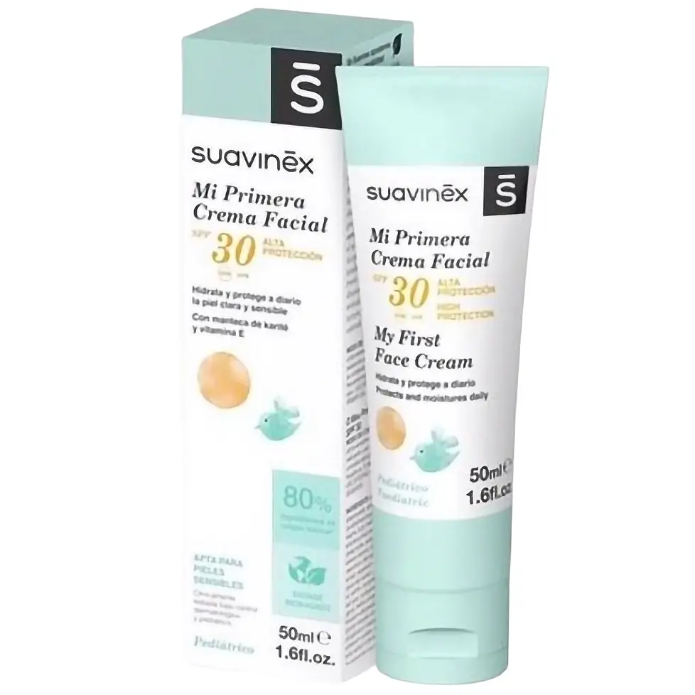 Дитячий крем для обличчя Suavinex My First Face Cream SPF30 з фактором захисту від сонця 30 UVB та UVA зволожує та захищає ніжну шкіру обличчя, особливо чисту та чутливу від зовнішніх впливів, таких як забруднення, холод чи вітер.