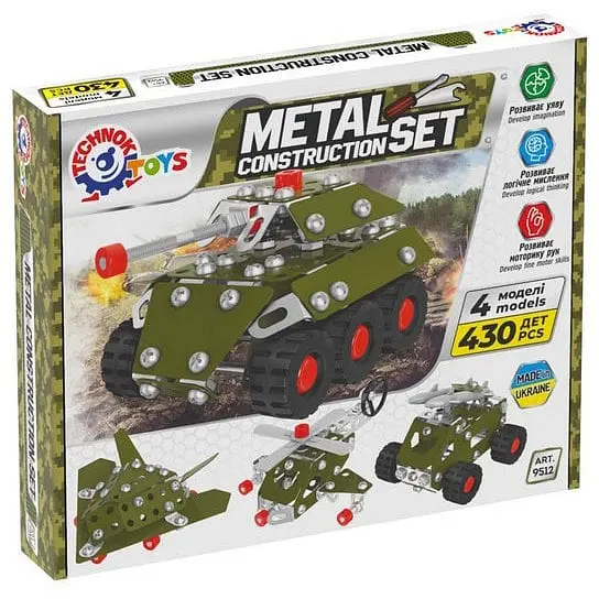 Якщо ви шукаєте цікавий і захопливий подарунок для дітей від 7 років, то металевий конструктор із пластиковими елементами ТехноК арт.9512 - це саме те, що вам потрібно, щоб відірвати майбутнього захисника від надокучливих гаджетів. З цього конструктора одночасно можна зібрати чотири різні моделі військової техніки, які стануть незамінними помічниками у фантастичних пригодах вашої дитини. Ваш маленький генерал зможе створити свою армію для захисту рідної землі від ворога. Металевий конструктор складається з 430 різних деталей, з яких можна зібрати такі моделі: Ракетна установка з двома ракетами. Має поворотну платформу та регульований кут нахилу. Літак "невидимка", що має аеродинамічну форму. Військовий гелікоптер, який має потужний гвинт і кабіну для пілота. Бронетранспортер із поворотною гарматою та пластиковими колесами. Чому саме цей конструктор? - На відміну від більшості конструкторів, з цього конструктора можна зібрати одночасно 4 (.) моделі. - деталі виготовлені з високоякісного металу методом лазерного різання. Вони мають високу точність і легко з'єднуються між собою. - Порошкове покриття кольору хакі надає моделям автентичності та реалістичного вигляду "мілітарі". - Пластикові елементи надають функціональність і колірні акценти. - У комплекті - набір ключів і зручна викрутка. - Для складання моделей у комплекті виробу є детальна кольорова інструкція на 8 сторінках, яка показує крок за кроком, як скласти всі моделі. Інструкція має зручний формат і яскраве оформлення. Металевий конструктор із пластиковими елементами - це не лише гра, а й розвивальний набір, що сприяє розвитку просторового мислення, логіки, уяви, моторики рук та інженерних навичок. Ваша дитина отримає задоволення від процесу складання моделей і гри з ними. Купіть металевий конструктор із пластиковими елементами зараз і даруйте своїй дитині незабутні враження та години захопливої гри. Цей конструктор - ідеальний подарунок для дітей, які люблять військову тематику і конструювання. Не пропустіть можливості зробити свою дитину щасливою.