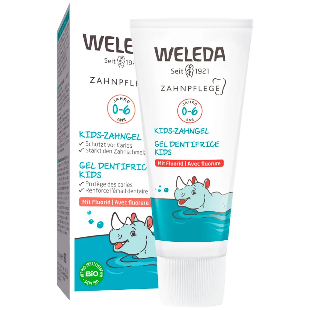 Зубний гель Weleda для дітей з фтором розроблений для надійного догляду за молочними зубами та профілактики карієсу. Спеціально розроблена формула допомагає зміцнити зубну емаль і підтримувати здоров'я ясен у дітей з моменту появи першого зуба до 6 років. Гель містить фторид натрію (1000 ppm), що зміцнює зуби та попереджає карієс. Він також дбайливо очищує емаль завдяки діоксиду кремнію та зменшує запалення завдяки компонентам календули та кори кінського каштана.