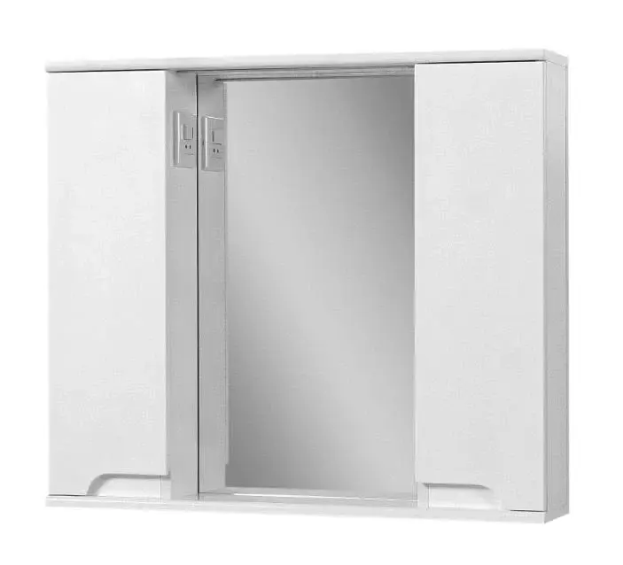 Дзеркало 80 см, габарити (ВхШхГ): 730х800х166 мм, з LED підсвічуванням і розеткою з вимикачем, оснащено двома дверцятами, а всередині по дві скляні полички. Корпус виконаний з ламінованого ДСП в білому кольорі, має додаткове лакове глянсове покриття. Фасад складається з білої лицьовій панелі, яка виконана з МДФ і грунтовані, поверх покрита лаком з високим ступенем блиску. Ручки в даному дзеркалі мають приховану форму. Можлива комплектація тумбою і пеналом.