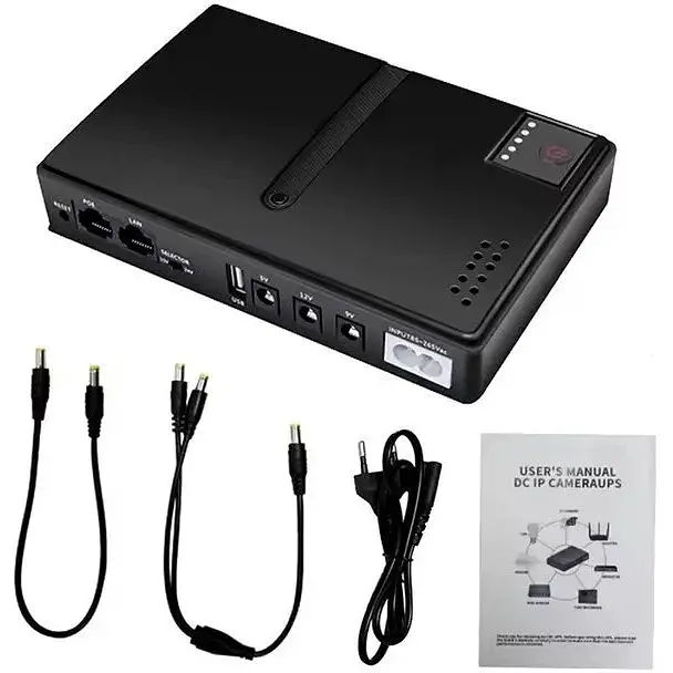 Павер-банк для роутера термінала модема UPS DC1018L 11600mAh 18 W (DC 5 / 9 / 12V / USB / PoE) Джерело безперебійного живлення DC1018L 5-12 В максимальною потужністю 18 Вт, з вбудованими літієвими акумуляторами загальною ємністю 11600 мА·год. ДБЖ забезпечує резервним електроживленням пристрою з вхідною напругою до 12 В в умовах знеструмлення або нестабільної роботи електромережі. Одночасно здатний живити до трьох пристроїв, наприклад: ONU-термінал, Wi-Fi роутер, смартфон/планшет, камери відеоспостереження тощо. Має на борту такі роз'єми: DC 9 В, DC 9 В, DC 12 В, USB Type-A 5 В, POE 15V/24V (з перемикачем) і вхідний роз'єм 85-265В для під'єднання пристрою до електромережі. Вихід: USB 5V/2A, DC9V/2A, DC12V/1A, POE 15V/0.6A, POE 24V/0.6A Вихідна потужність: 18W (Макс) Вхідна напруга: 85-265 В змінного струму, 50/60 Гц Вихідна напруга: 5В/9В/12В Акумуляторні батареї - чотири вбудовані Li-ion акумулятори типу 18650 ємністю 2900 мА·год (загальна ємність 11600 мА·год або 42 Вт·год). ДБЖ може забезпечити безперебійну роботу під'єднаних до нього приладів в умовах браку електрики впродовж від 6 до 24 годин (залежно від сумарної потужності цих пристроїв), а час повного заряджання акумуляторів ДБЖ становить приблизно 2 години. Принцип роботи такий: через вхідний роз'єм ДБЖ під'єднується до електромережі, інші пристрої під'єднуються до вихідних роз'ємів, згідно зі своєю робочою напругою. Якщо на вході ДБЖ є електроживлення - він автоматично заряджає свої батареї та живить зовнішні прилади. У разі зникнення електрики на вході DC1018P, він миттєво переходить на свій акумулятор, під'єднаний пристрій «не помітить» перемикання й зможе далі працювати (до 10 годин) на заряді батарей до відновлення зовнішнього електроживлення. Джерело безперебійного живлення дає змогу вам бути з інтернетом навіть коли у квартирі або будинку немає електрики. Комплектація: Міні ДБЖ; Кабель живлення; Кабель під'єднання DC 5.5 - DC 5.5 (1 вихід); Кабель під'єднання DC 5.5 - DC 5.5 (2 виходи); Інструкція з експлуатації Артикул DC1018L id yul-170126 ol-910939165