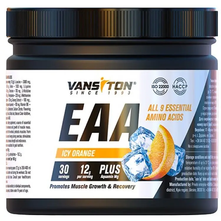 EAA Vansiton містить у своєму складі всі 9 незамінних амінокислот, які організм не може виробляти самостійно. Вони є ключовими будівельними блоками для синтезу білків, що є важливим для росту і відновлення тканин. Вони також сприяють швидкій регенерації тканин та зменшують ризик появи м'язової втоми та різноманітних пошкоджень.