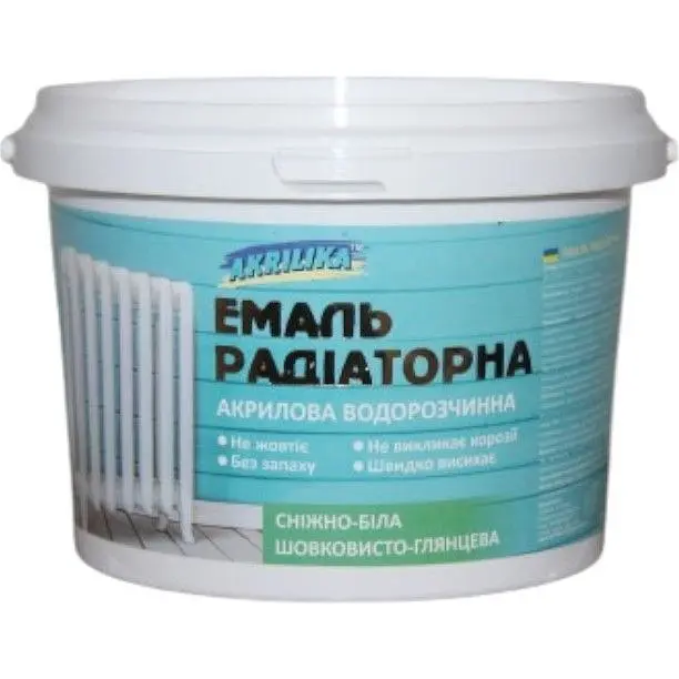 Akrilika Емаль радіаторна (біла) Склад: Емаль виготовлена на основі ультрабілого пігменту в водній дисперсії високоякісного акрилового полімеру з додаванням інгібітора корозії та спеціальних допоміжних речовин. Властивості: Завдяки спеціально підібраним компонентам емаль створює покриття, стійке до нагрівання до +100 °C і може наноситися безпосередньо на метал, не викликаючи його корозії. Має високу покривну здатність і чудову адгезію до фарбуваної поверхні, абсолютно нешкідлива для здоров'я і практично не має запаху, легко наноситися і швидко висихає, утворюючи гладке білосніжне та зносостійке покриття, не жовтіє й не Глянець не на світлі, не в темряві. Призначення: Призначається для декоративно-захисного фарбування радіаторів і систем опалення, а також може використовуватися для фарбування старих олійних і алкідних покриттів, дерев'яних і дерево подібних основ, металевих і чавунних елементів, оцинкованого металу, гіпсокартонних плит і штукатурок, усередині приміщення. Особливості: Стійка до підвищених температур (до 100 °C) Нешкідлива для здоров'я і практично не має запаху Сніжно-біла, не жовтіє й не втрачає глянець Швидко висихає (на відлип не більш ніж 60 хвилин) Не викликає корозії й може наноситися безпосередньо на метал Має високу покривну здатність, чудову адгезію і зносостійкість Може наноситися на оцинкований метал, а також на олійні й алкідні покриття Легко наноситься, рівномірно розподіляючись утворюючи гладку поверхню без патьоків