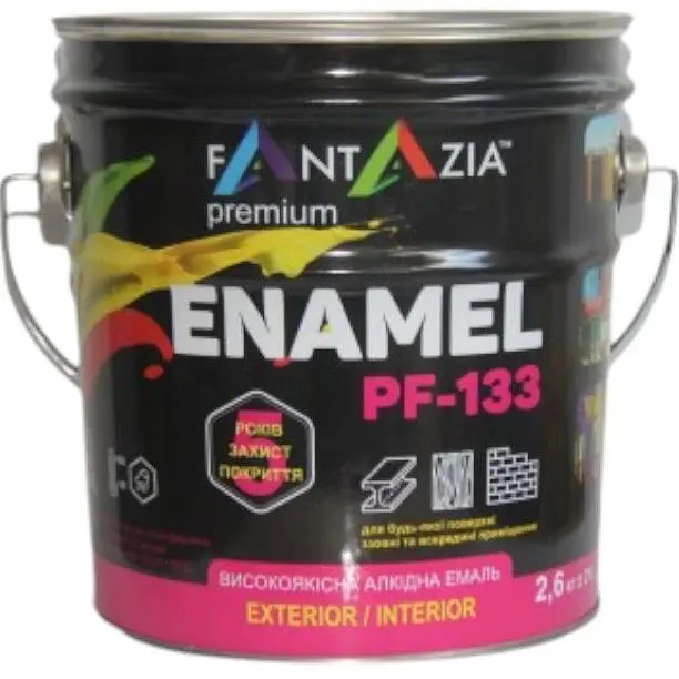 Емаль ПФ-133 Fantazia 2,6 кг (чорний) Premium Більше кольорів: Сфера застосування: Емаль ПФ-133 призначена для фарбування металевих об'єктів і поверхонь, а також вантажного рухомого складу (крім рефрижераторних вагонів), контейнерів та інших дерев'яних поверхонь, атмосферних впливів, що зазнають. Має високий блиск і стійкість. Переваги: - покриття емалі утворює рівну, гладку поверхню, забезпечує отримання, глянсового покриття; еластичного, має гарні декоративні властивості; - емаль однокомпонентна, стабільна під час зберігання, має чудові малярні властивості, що створює зручність у застосуванні; - емаль ідеально підходить для фарбування дерев'яних поверхонь, що не потребують високих експлуатаційних характеристик: житлових і побутових дерев'яних скринь і огорож, а також металевих поверхонь (забори, решітки, огорожі тощо).