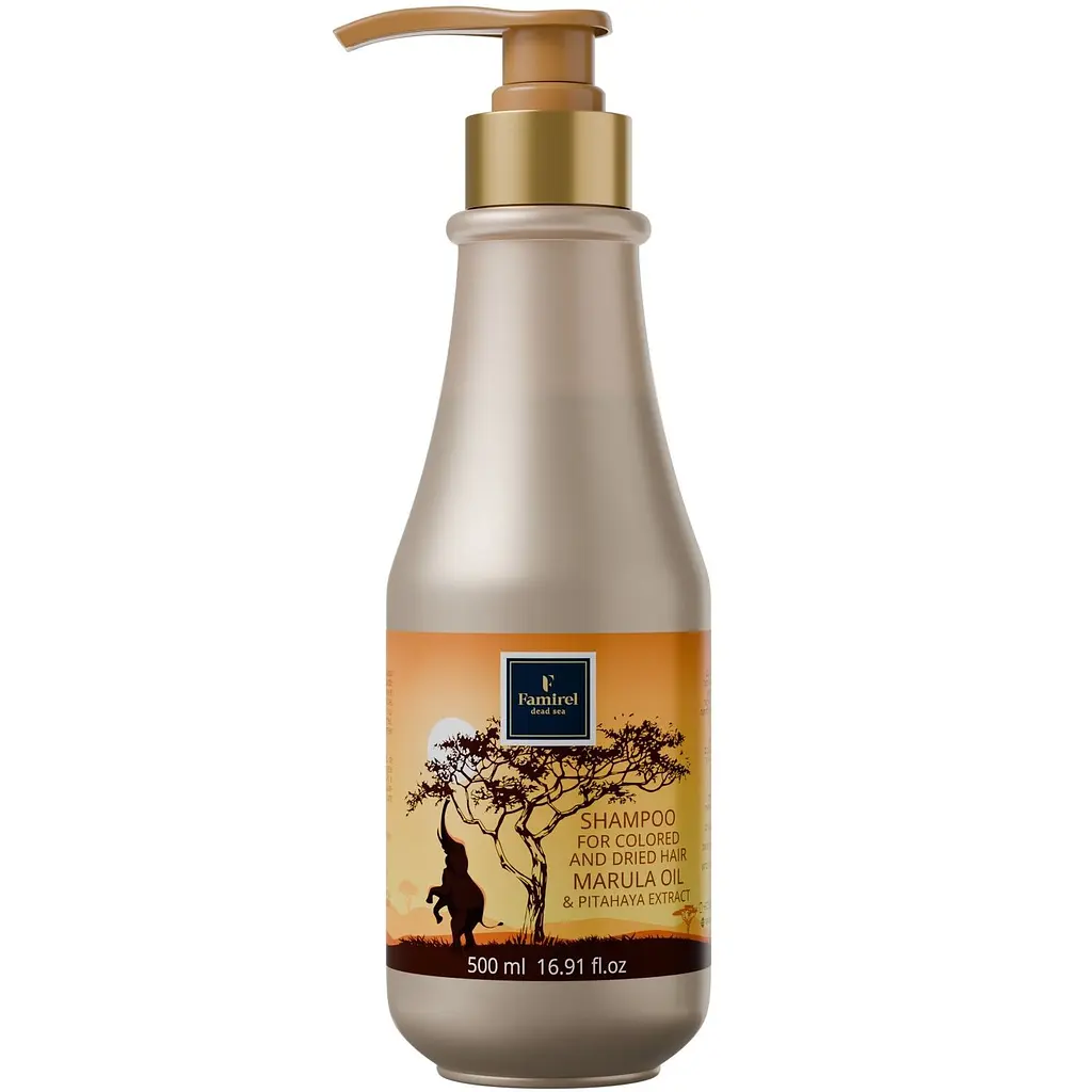 Шампунь Famirel Marula Oil для фарбованого і сухого волосся з олією льону з унікальною формулою зберігає яскравість кольору волосся впродовж тривалого часу, забезпечуючи водночас м'якість і бархатистість. Перешкоджає швидкому відкриттю кутикули волосся, що допомагає утримувати колір усередині волосини, а також ніжно очищає та зволожує шкіру голови. Природні олії та вітаміни зволожують і відновлюють волосся.