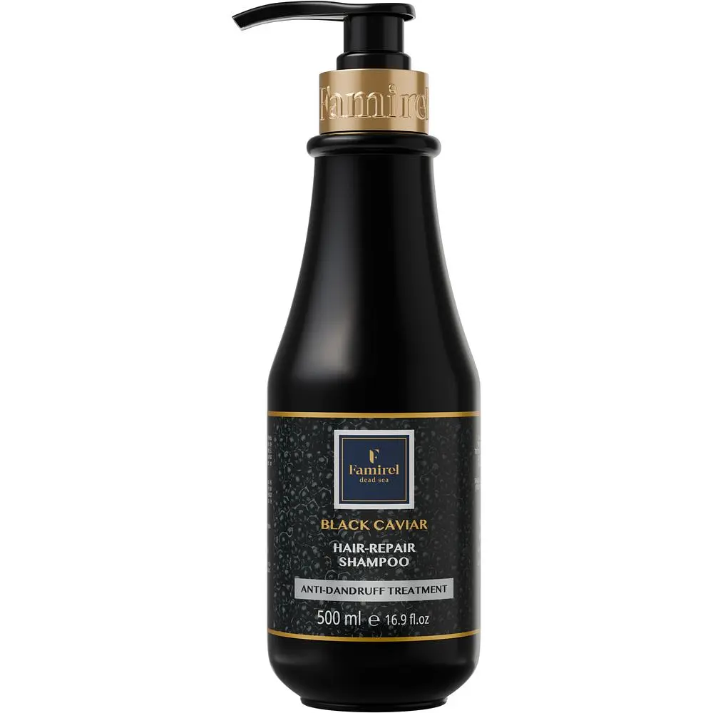 Відновлювальний делікатний шампунь Famirel Black Caviar, спеціально розроблений для ретельного очищення волосся і шкіри голови. Формула, збагачена компонентами чорної ікри та потужними антиоксидантними властивостями граната, які захищають волосся. До складу входять компоненти та вітаміни, які живлять шкіру голови й ефективно запобігають утворенню лупи. Після використання шампуню волосся не тільки очищається і стає неймовірно м'яким, а й оптимально готується до подальшого догляду за допомогою кондиціонера або відновлювальної маски.