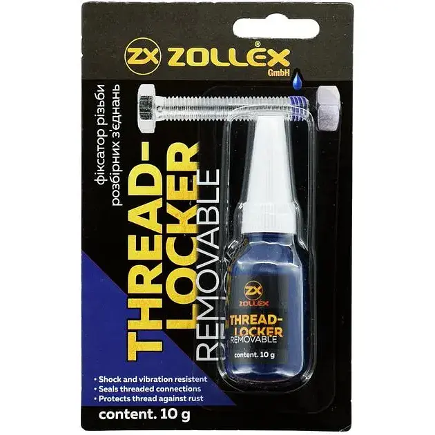 Фіксатор різьбових з'єднань Zollex BFU-1 синього кольору розроблений спеціально для тривалої та ефективної фіксації металевих болтів, гайок, шпильок, гвинтів. Фіксатор різьбових з'єднань фіксує різьблення, запобігає ослабленню і самовідгвинчування деталей під впливом вібрації, механічних і температурних навантажень.