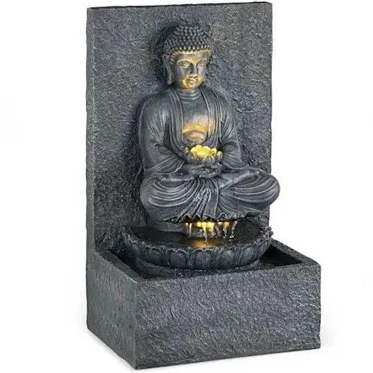 Садовий фонтан Nirvana з фігурою Будди в сидячому положенні приємно компактний із своїми розмірами 36 x 65 x 29 см (Ш x В x Г) і наповнює вітальні та сади розслаблюючою аурою завдяки своєму гармонійному вигляду. М'яке освітлення надає фігурі додатковий блиск і робить її естетичною гаванню спокою навіть увечері та вночі. Окрім релаксаційного ефекту, декоративний фонтан у домі має додатковий позитивний вплив на здоров’я: він автоматично зволожує повітря, покращує мікроклімат у приміщенні та дозволяє зітхнути з полегшенням. Колодязний насос забезпечує безперервну роботу замкнутого водяного контуру з потужністю 7 Вт, заощаджуючи енергію, і працює приємно тихо навіть у безперервній роботі. Завдяки виготовленню міцного полірезину садовий фонтан добре захищений від вітру та погоди. Тому його можна встановити та милуватися на свіжому повітрі цілий рік. Ще однією перевагою матеріалу є відносно невелика вага, що значно полегшує як переміщення, так і транспортування колодязя. Завдяки своєму сіруватому кольору та стриманому ефекту садовий фонтан Nirvana ідеально впишеться в будь-який сад і житлове середовище. Кабель живлення довжиною 5 метрів полегшує вибір місця та допомагає з гнучким позиціонуванням.
