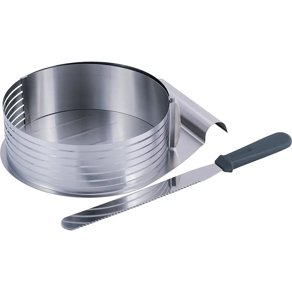 Форма для бісквіта Kamille - це ідеальний інструмент для кондитерів та любителів випічки, який дозволяє легко та рівномірно нарізати бісквітні коржі. Завдяки регульованому діаметру від 24.5 до 33 см, форма підходить для різних розмірів тортів, забезпечуючи універсальність у використанні.