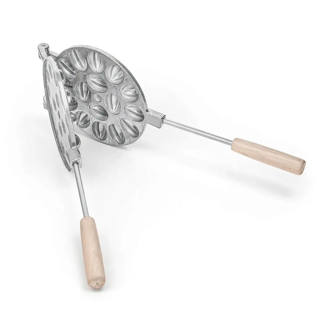 Форма для випікання горішків — це перевірений поколіннями інструмент для створення улюблених ласощів із начинкою зі згущеного молока. Виготовлена з харчового алюмінієвого сплаву, вона має високу теплопровідність, що гарантує швидке та рівномірне пропікання кожної «шкаралупки». Конструкція розрахована на одночасне приготування 16 половинок (8 цілих горішків), що значно пришвидшує процес порівняно з меншими аналогами. Форма призначена для використання на газових або електричних плитах (крім індукційних) та оснащена довгими ручками з дерев'яними наконечниками, які захищають руки від опіків та забезпечують зручне стискання половинок.