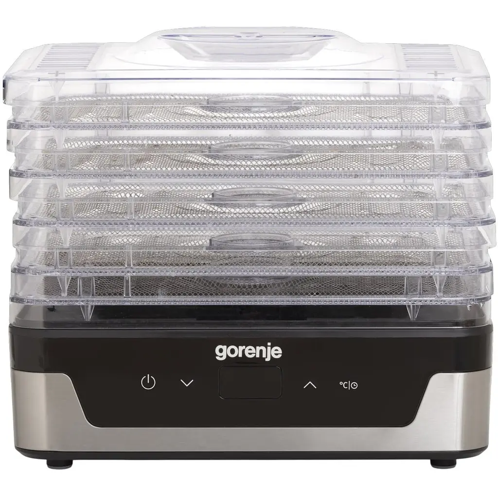 Сушарка для продуктів Gorenje FDK400DE з електронним керуванням та потужністю 240 Вт має 5 регульованих лотків діаметром 29 см та дозволяє сушити фрукти, овочі, м'ясо, рибу, гриби та інші продукти при температурі від 35 °C до 75 °C. Оснащена LED-дисплеєм, таймером до 48 годин, автоматичним вимкненням та гумовими ніжками для стійкості.
