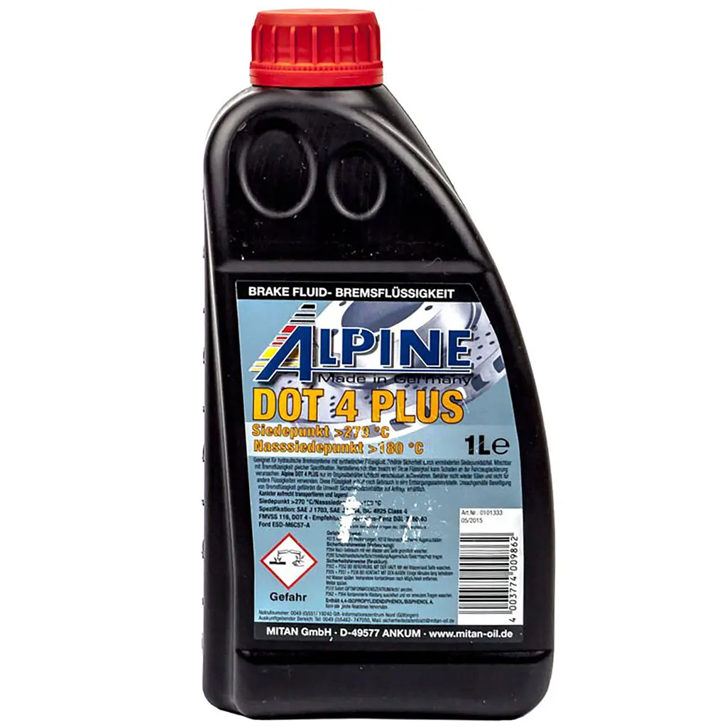 Гальмівна рідина Alpine Brake Fluid DOT4 Plus - синтетична гальмівна рідина. Має стійкість до низьких температур, нейтральна до ущільнювальних елементів. Має високу температуру кипіння й чудовий захист усіх металевих деталей гальмівної системи від корозії. Забезпечує якісний захист від зносу та піноутворення. Змішується з будь-якими синтетичними гальмівними рідинами аналогічної якості.