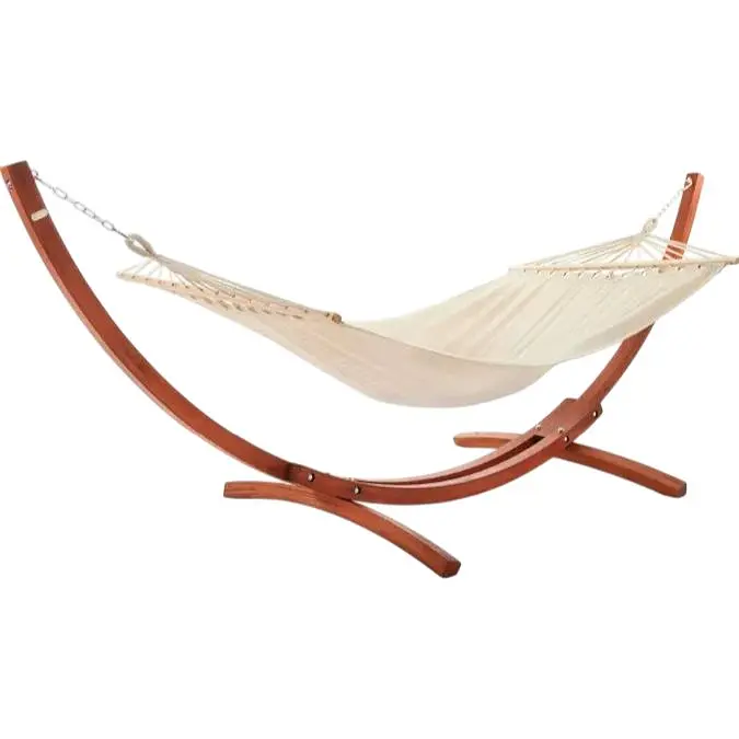 Каркас виготовлено з натуральної модрини, відомої своєю стійкістю до вологи, механічних навантажень та часу. Промаслене покриття з ефектом тика не лише захищає деревину, а й підкреслює її теплий, насичений колір. Завдяки товстому профілю 6x6 см гамак для дачі вирізняється стабільністю й надійністю, а витончена вигнута форма надає конструкції елегантності.