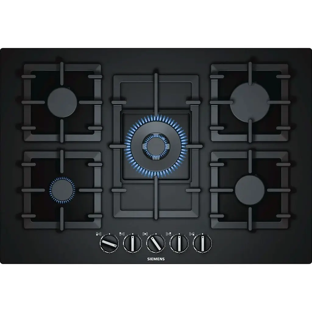 Газова варильна поверхня Siemens EP7A6QB90 поєднує елегантний зовнішній вигляд і функціональність, надаючи п'ять конфорок різної потужності для роботи з посудом будь-якого розміру. Основа виконана з високоміцного загартованого скла HardGlass, яке надає панелі преміальний вигляд і легко очищається від будь-яких забруднень. Збільшені габарити варильної поверхні 752×520 мм забезпечують комфортне розміщення великого посуду і нестандартні комбінації конфорок для максимальної зручності приготування.