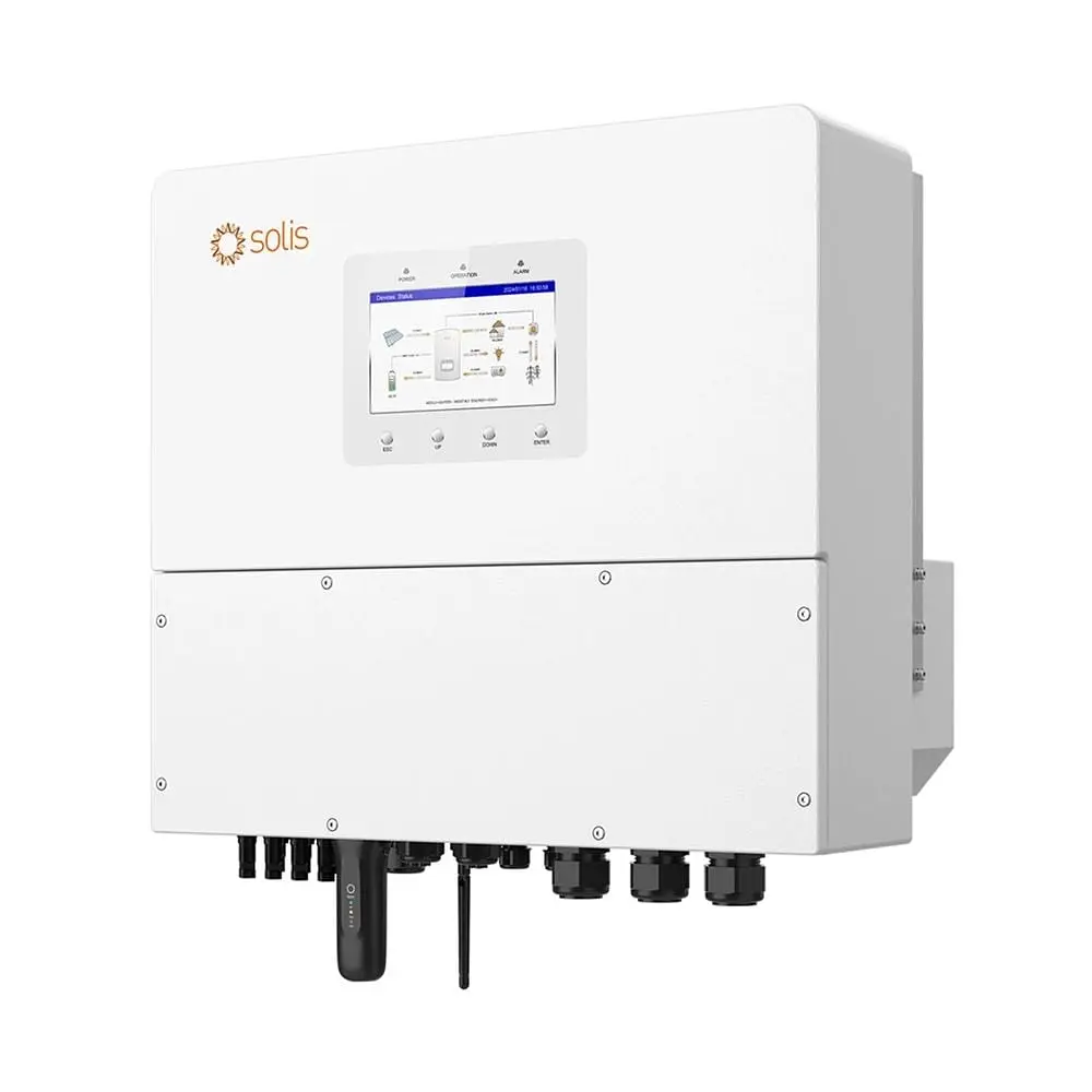 Гібридний трифазний інвертор Solis S6-EH3P20K-H з номінальною потужністю 20 кВт (пікова потужність 30 кВт), з 4 вбудованими MPPT-контролерами. Може підключатися до акумуляторних батарей системи накопичення енергії. Діапазон напруги від сонячних панелей 200-850 В, максимальна потужність сонячних панелей 40 кВт. Напруга акумуляторної батареї 120-800 В, максимальний струм заряду 50 А / розряду 50 А. Вихідна напруга 400 В, ККД 97.5%. Можливість підключення генератора.