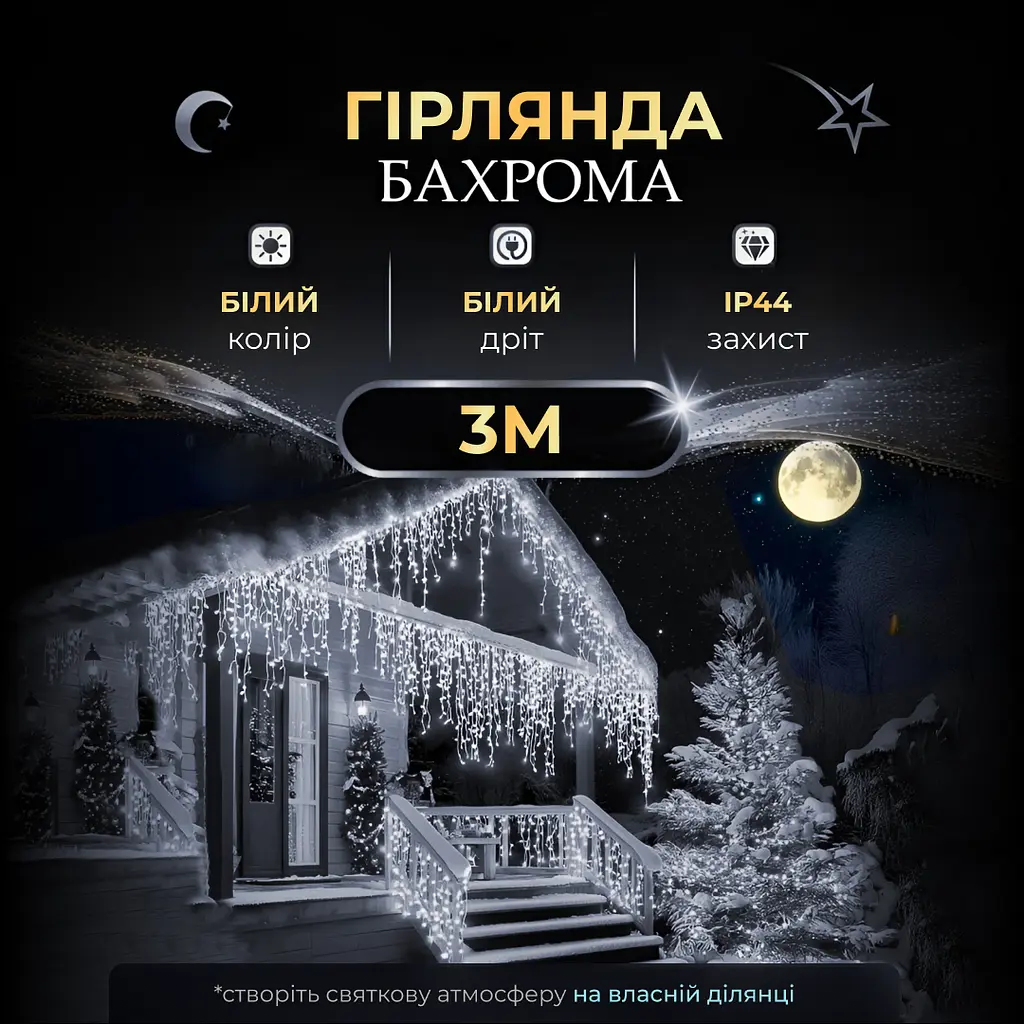 Переваги гірлянди Бахрома: Ефектний дизайн: Каскад спадаючих світлодіодів привертає увагу і створює святкову атмосферу. Яскраве освітлення яскраве освітлення: 90 світлодіодів забезпечують чарівне освітлення для будь-якого заходу. Універсальність: Підходить для використання як на вулиці, так і в приміщенні. Компактність: 3 метри довжини дозволяють декорувати різні простори. Всепогодність: Морозостійкі матеріали витримують навіть зимові холоди. Економічність: Споживає мінімум енергії, що робить її вигідним рішенням. Безпека: Захищена від перегріву та короткого замикання. Легкий монтаж: Легко підвішується за допомогою гачків або спеціальних кріплень.