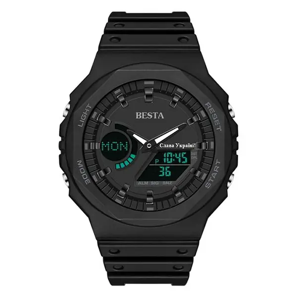 Тип механізму: Кварцові, Водостійкість: 5 атм - плавання, Тип ремінця: Каучуковий, Бренд: Besta, Стать: Чоловічі, Індикація: Аналогові, Електронні, Функції: Пластик, Застібка: Класична, Товщина: 15 мм, Форма корпусу: Круглий, Матеріал ремінця: Каучуковий, Додаткові характеристики: Індикація місяця, Особливості: Інструкція на російській мові, Вага, г: 60, Розміри, мм: 42х15, Колір корпусу: Чорний,2, Формат часу: секунди, години, Вид індикації: Індекси, арабські цифри, Діаметр: 42 мм, Фабрика збірки: Китай, Тип циферблата: Комбінований (аналогово-стрілочний), Гарантія: 12 місяців, Механізм: Кварцовий, Браслет / Ремінець: Ремінець, Матеріал: Пластик, Матеріал: Пластик Водостійкість: 5 атм - плавання, Скло: Полікарбонатне, Колір корпусу: Чорний, Товщина: 15 мм, Вага, г: 60, Індикація: Хвилини, секунди, годинник, Можливість зняти ремінець: Ні, По діаметру годин: Середні, Довжина ремінця, см: 24 см2 (регулюється) Класична, Розміри, мм: 42х15, Функції: Секундомір, будильник, підсвічування, час показується на циферблаті та стрілками, дата, день тижня, місяць, Додаткові характеристики: Індикація місяця, Для чоловіків: Для чоловіків, Для військових: Тактичні, Матеріал корпусу: Полікарбонат, Фабрика збірки: