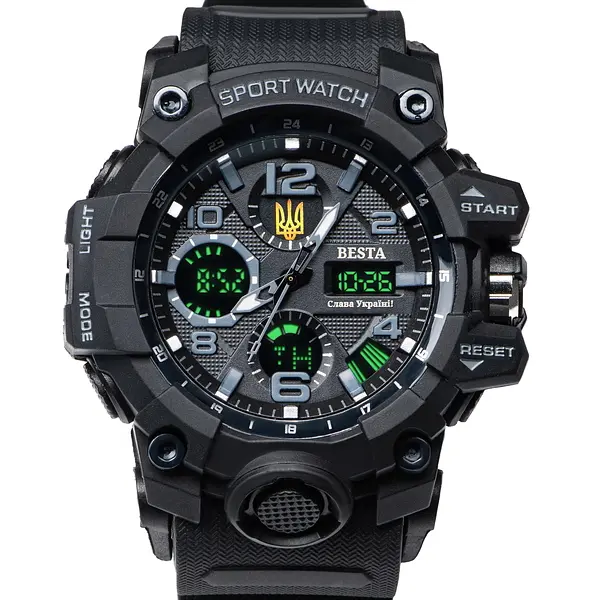 Тип механізму: Кварцовий, Водостійкість: 5 атм - плавання, Тип ремінця: Каучуковий, Бренд: Besta, Стать: Чоловічі, Індикація: Аналогові, Електронні, Функції: Матеріал: Пластик, Застібка: Класична, Товщина: 19 мм, Форма корпусу: Круглий, Матеріал ремінця: Каучуковий, Додаткові характеристики: Індикація місяця, Особливості: Інструкція на російській мові, Вага, г: 60, Розміри, мм: 50х19, Колір корпусу: 1, Чорний Хвиліні, секунди, години, Індикація: Мітки, арабські цифри, Діаметр: 50 мм, Фабрика збірки: Китай, Тип циферблата: Комбінований (аналогово-стрілочний), Особливості циферблата: Центральна секундна стрілка, Гарантія: 12 місяців, Механізм: Кварцов, Матеріал корпусу: Полікарбонат, Колір ремінця: Чорний, Водостійкість: 5 атм - плавання, Скло: Полікарбонатне, Колір корпусу: Чорний, Товщина: 19 мм, Вага, г: 60, Індикація: Хвилини, секунди, годинник, По діаметру годин: Великі, Довжина ремінця 12/24 год, Застібка: Класична, Розміри, мм: 50х19, Функції: Трузуб, секундомір, будильник, підсвічування, час показується на циферблаті та стрілками, дата, день тижня, місяць, Додаткові характеристики: Індикація місяця, Для чоловіків, Для чоловіків, Для військових: Тактичні, Матеріал індикації: Мітки, арабські цифри, Особливості циферблата: Центральна секундна стрілка