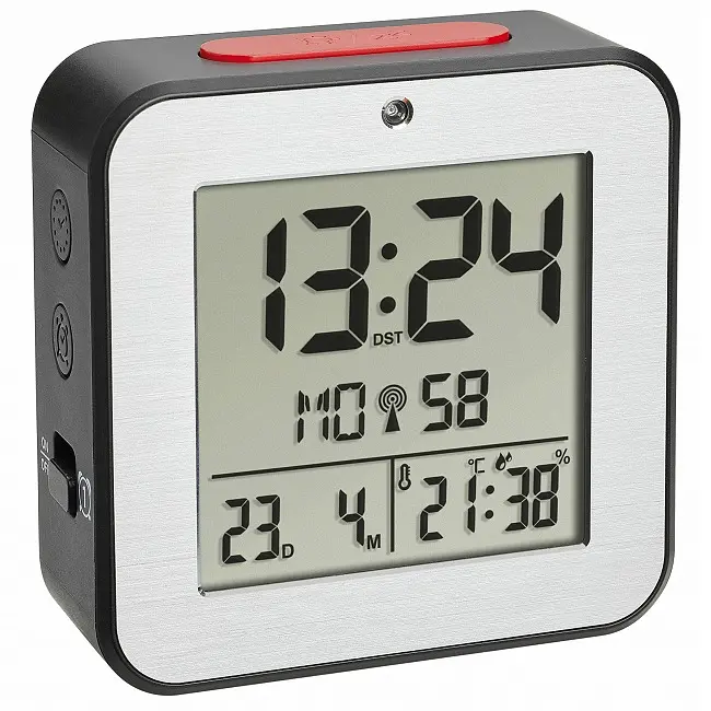 Виробник: TFA Dostmann GmbH & Co.KG, Germany Особливості: Два окремі будильники Функція повтору Індикація дня тижня та дати Температура та вологість у приміщенні Автоматичне підсвічування з датчиком освітлення Алюмінієвий фасад Високоточний радіокерований годинник