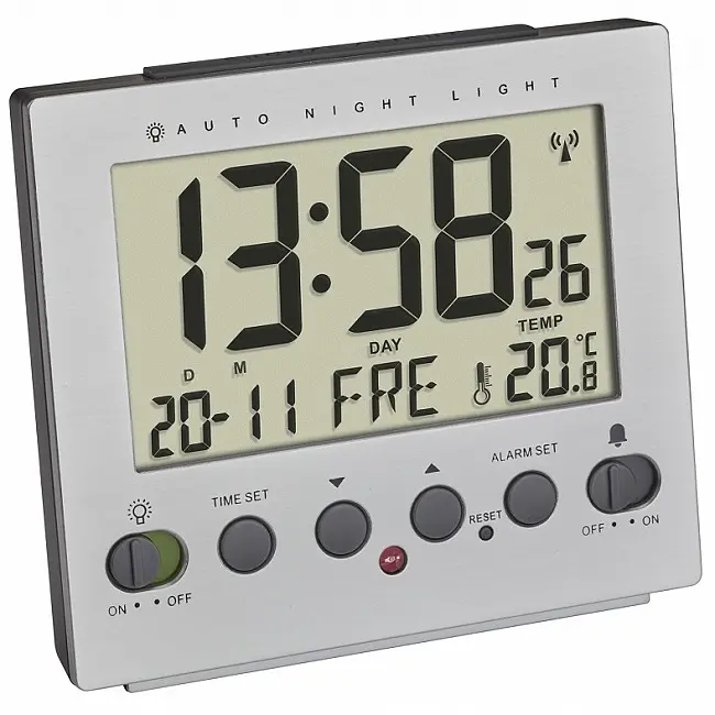 Виробник: TFA Dostmann GmbH & Co.KG, Germany Особливості: Високоточний радіокерований годинник. Будильник із функцією повтору. День тижня англійською мовою (8 мов) та дата. Температура у приміщенні. Можливість ручного налаштування та корекція часового поясу. М'яке постійне нічне підсвічування активується за допомогою датчика освітлення. Алюмінієвий вигляд. Цей радіокерований будильник у корпусі з привабливим алюмінієвим зовнішнім виглядом приймає сигнал часу DCF77 і автоматично синхронізується з високоточним атомним годинником недалеко від Франкфурта. Це означає, що ви завжди бачите поточний час і прокидаєтеся вчасно. Дата та день тижня також встановлюються автоматично. Якщо ви хочете постійно знати час вночі, ви можете налаштувати будильник так, щоб у темряві включалося постійне слабке підсвічування дисплея. Завдяки енергозберігаючій світлодіодній технології батареї, як і раніше, служать довго. Якщо ви натиснете велику кнопку зверху, яскраве підсвічування загориться і знову згасне за кілька секунд. Якщо будильник спрацює, вона так само активує функцію повтору, щоб ви могли продовжити відпочинок ще на п'ять хвилин. Індикація температури допомагає регулювати мікроклімат у спальні: для гарного сну температура не повинна перевищувати 18 °C. Якісний продукт від TFA Dostmann GmbH & Co.KG, Germany