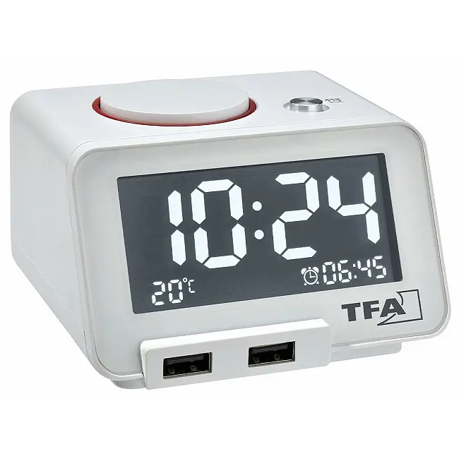 Виробник: TFA Dostmann GmbH & Co.KG, Germany Особливості: Великий РК-дисплей з 4 рівнями яскравості Просте налаштування часу з диском, що обертається Функція заряджання для мобільних пристроїв через два порти USB (макс. 2 А) Мелодія будильника з регульованою гучністю Будильник із функцією повтору Температура у приміщенніПідставка з 2 гумовими накладками Дуже стильний зовнішній вигляд Настільна установка Адаптер живлення у комплекті Цей високоякісний цифровий будильник вражає великим, висококонтрастним РК-дисплеєм та зручним налаштуванням. У той же час, у вас є можливість заряджати мобільні пристрої на ніч за допомогою двох USB-портів. Що ще хочете від будильника? Годинник і час будильника можуть бути скориговані за допомогою великої ручки, що обертається, зверху. Ви обов'язково прокинетеся з дружньою та своєчасною мелодією, а завдяки функції повтору ви можете поспати кілька додаткових хвилин. Гучність будильника можна регулювати за необхідності. Вбудований термометр вимірює температуру в приміщенні та забезпечує гарний клімат у спальні. Для хорошого нічного сну температура не повинна перевищувати 18 °C або опускатися нижче 16 °C.
