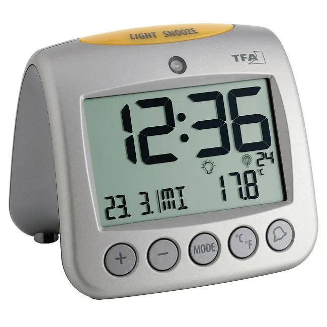 Виробник: TFA Dostmann GmbH & Co.KG, Germany Особливості: Високоточний радіокерований годинник (DCF77 - сигнал) Налаштування часового поясу Подвійний час Індикація температури у приміщенні Індикація дати та дня тижня Два окремі будильники Функція повтору сигналу будильника Наростаючий сигнал будильника Енергозберігаюче автоматичне світлодіодне підсвічування в темряві з датчиком освітленості Eco Light Sensor Батарейки у комплекті Зареєстрований дизайн TFA З радіокерованим будильником «SONIO» від TFA ви завжди будете добре поінформовані і почнете день якнайкраще. Час встановлюється з точністю до секунди за допомогою сигналу DCF77, і перемикання із зимового на літній час також відбувається автоматично. Крім того, будильник відображає день тижня та дату. Ви також маєте можливість встановити другий час, що ідеально, якщо ви часто телефонуєте за кордон. З двома різними часами будильника, наприклад, у будні та вихідні дні ви завжди прокидаєтеся у потрібний час. Функція повтору дозволяє м'яко прокинутися. Вбудований термометр вимірює температуру в приміщенні та забезпечує гарний клімат у спальні. Для гарного нічного сну температура не повинна бути вище 18 °C або опускатися нижче 16 °C. Щоб було зручно читати дисплей вночі, будильник має стримане та економічне світлодіодне підсвічування, яке автоматично включається в темряві через датчик освітлення.