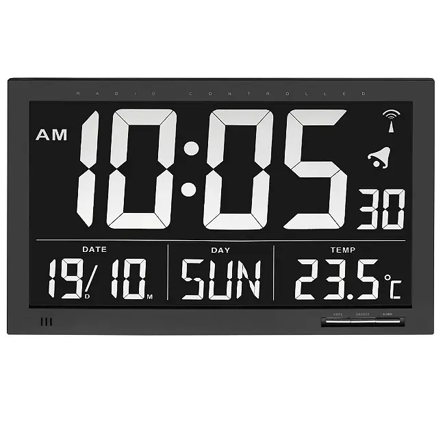 Виробник: TFA Dostmann GmbH & Co.KG, Germany Особливості: Формат XL з інвертованим дисплеєм Радіокерований годинник найвищої точності Дата та день тижня (8 мов) Будильник із функцією повтору Індикація температури у приміщенні Будильник із функцією повтору Опція ручного налаштування та часового поясу Цей сучасний годинник з радіокеруванням від TFA Dostmann виділяється дуже великим інвертованим дисплеєм. Біле на чорному, годинник з радіокеруванням легко читається здалеку і особливо підходить для входу або стійки реєстрації, залу очікування та офісу. Крім дати з днем тижня також відображається температура в приміщенні. Таким чином, ви можете забезпечити приємний клімат у своїх житлових та робочих приміщеннях. Час встановлюється з точністю до секунди за допомогою сигналу DCF77, і перехід із зимового на літній час також відбувається автоматично. Чіткий дизайн цього радіокерованого годинника вписується в будь-яку обстановку, незалежно від того, чи віддаєте ви перевагу настінному або окремо встановленому годиннику.
