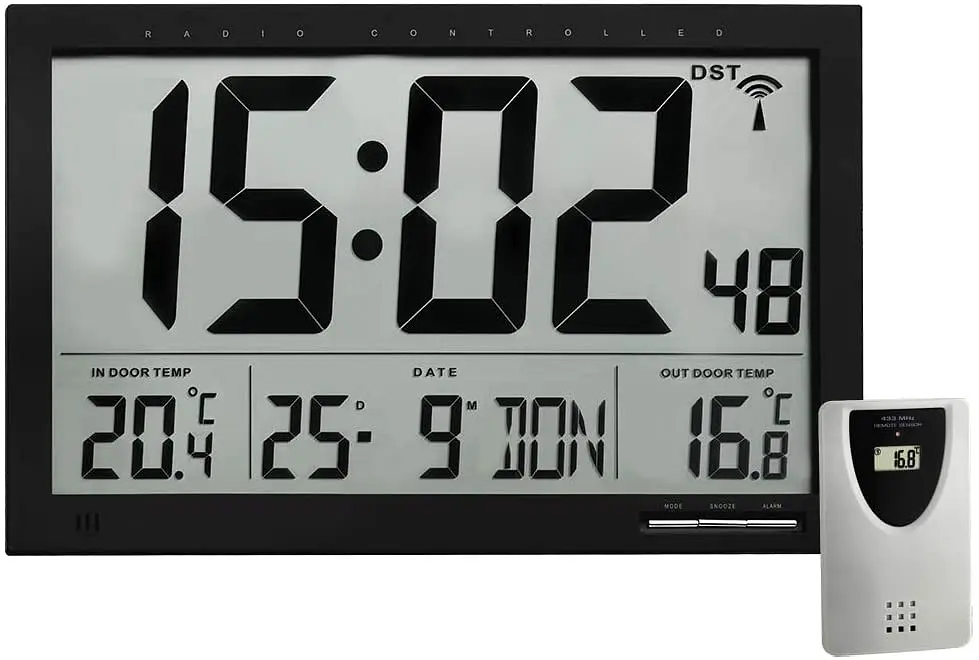 Виробник: TFA Dostmann GmbH & Co.KG, Germany Особливості: Формат XL з особливо чітким дисплеєм Радіокерований годинник найвищої точності Бездротова передача значення температури зовнішнього повітря за допомогою бездротового зовнішнього передавача на відстані до 100 м (на відкритій місцевості) Відображення температури у приміщенні Будильник із функцією повтору День тижня 8 мовами та дата Опція ручного налаштування та часового поясу Температурна сигналізаціяУ Вас завжди є точний час з цим дуже великим радіокерованим годинником від TFA. Час встановлюється з точністю до секунди за допомогою сигналу DCF77, і перехід із зимового на літній час відбувається автоматично. Дисплей дуже великий і чіткий, ідеально підходить не тільки для дому, а й для офісу, кімнати очікування, входу чи приймальні. Температура всередині та зовні приміщень відображається на дисплеї, поруч із датою та днем тижня. Щоб визначити температуру зовнішнього повітря, встановіть передавач, що додається, зовні. Потім виміряні значення передаються радіосигналом на відстань до 100 м (на відкритій місцевості) на годинник. Відмінна додаткова функція: температурна сигналізація – можна налаштувати так, щоб звучав сигнал тривоги, наприклад, у разі морозу або за дуже високих температур. Цей практичний пристрій також можна використовувати як будильник. Простий і зрозумілий дизайн цього радіокерованого годинника підходить для будь-якої обстановки, незалежно від того, волієте ви їх повісити на стіну або встановити на горизонтальну поверхню.