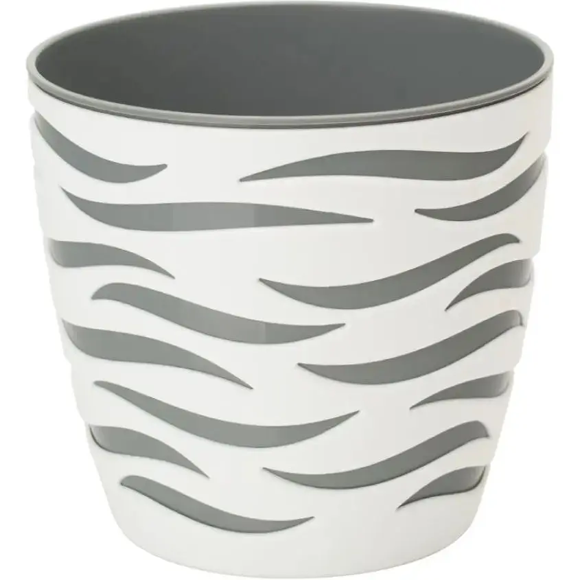 Квітковий горщик має в комплекті декоративне матове кашпо оформлене вирізаними хвилями, що додають горщику привабливості.