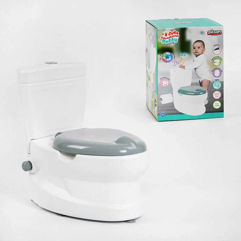 Дана модель виготовлена з високоякісної первинної пластмаси, відрізняється обтічною формою і товстими стінками. Конструкція надійно фіксується до будь-якого покриття завдяки гумовим антиковзким накладкам, які надійно закріплені знизу під виробом. Унітаз складається з фігурної основи зі знімним баком і внутрішньою знімною частиною. Також горщик обладнаний висувним тримачем для туалетного паперу. А для того, щоб ще більше зацікавити малюка, в бачку вбудований функціональний чіп, який при натисканні активує яскраву миготливе підсвічування і відтворює звук зливу води. Після кожного використання, виріб необхідно ретельно промивати теплим мильним розчином. Звукові та світлові ефекти працюють від батарейок, які входять в комплект.