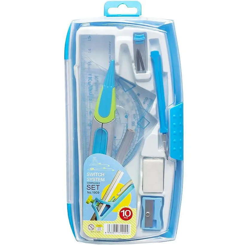 У пластиковій коробці в пластиковій коробці. У наборі циркуль, олівець, 2 грифелі та додаткова "ніжка" для циркуля, транспортир, лінійка, 2 трикутники, гумка, точилка Розмір 18х10 см