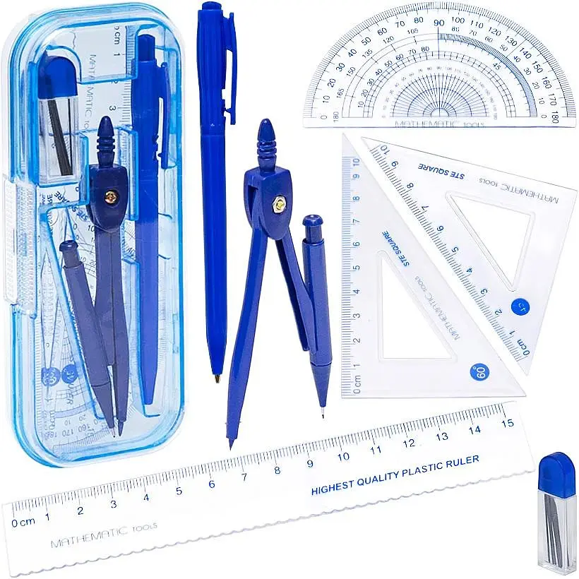 У пластиковій коробці: У наборі циркуль, вимірювач, транспортир, лінійка, 2 трикутники, ручка.