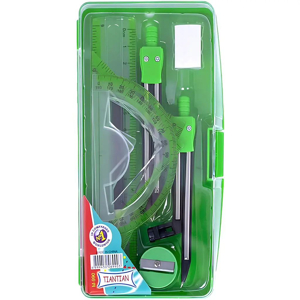 У наборі: циркуль, вимірювач, транспортир, лінійка, 2 трикутники.