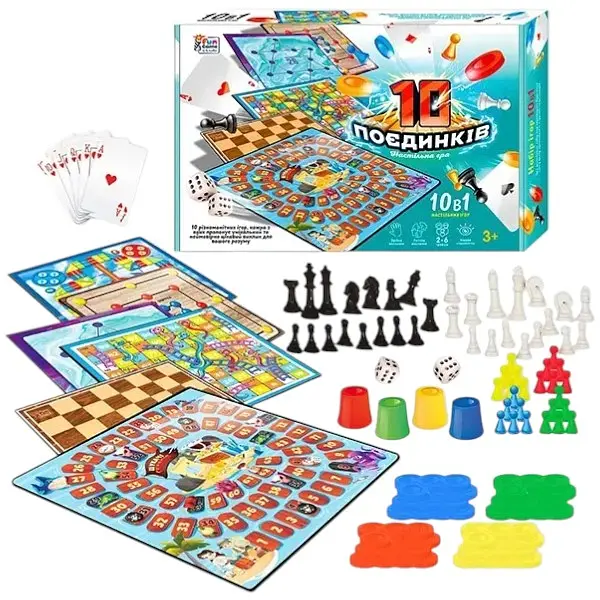 Гра 10 поєдинків Цей захопливий набір ігор перетворить будь-який стіл на центр креативності, стратегії та веселощів. Ви отримаєте 10 різноманітних ігор, кожна з яких пропонує унікальний і неймовірно цікавий виклик для вашого розуму. Ігровий набір є ідеальним компаньйоном для будь-якого заходу, чи то вечірка з друзями, чи то сімейне свято, чи то просто час, проведений разом із близькими. У наборі представлено: "Авіашахи" "П'ять у ряд" "Шашки 8х8" "Шахи" "Щаслива 26" "Дев'ять людей Морріса" "Здобувачі" "Брідж" "24 очки" "Змії та драбини" Країна виробник: Китай.