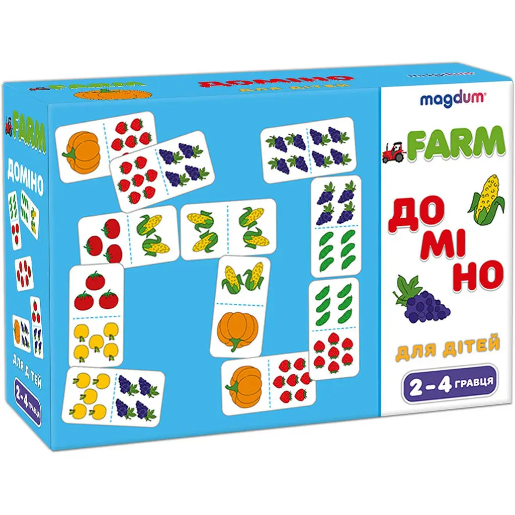 Разом з Доміно Фрукти-овочі дитина вивчить назви овочів та фруктів, легко навчиться розрізняти кольори та буде весело проводити час у колі друзів чи батьків.