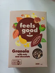 Гранола Feels Good з горіхами та шоколадом – це смачний і корисний продукт, створений для шанувальників здорового харчування. Вона виготовляється із запечених вівсяних пластівців із додаванням горіхів та шоколаду. У складі використовуються лише натуральні інгредієнти, без додавання штучних барвників, консервантів чи підсилювачів смаку.