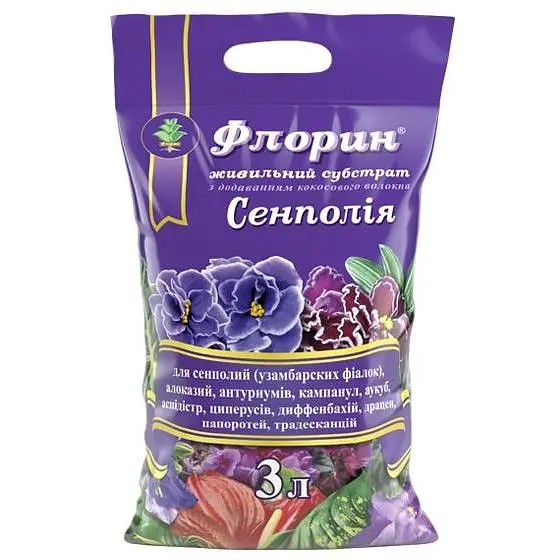 Повністю готовий живильний субстрат Флорин Сенполій, який проводиться з суміші торфів з додаванням подрібненого кокоса, кокосового волокна, органічних добавок, перліту, вапнякових матеріалів, піску, мінеральних макро- і мікродобрива.