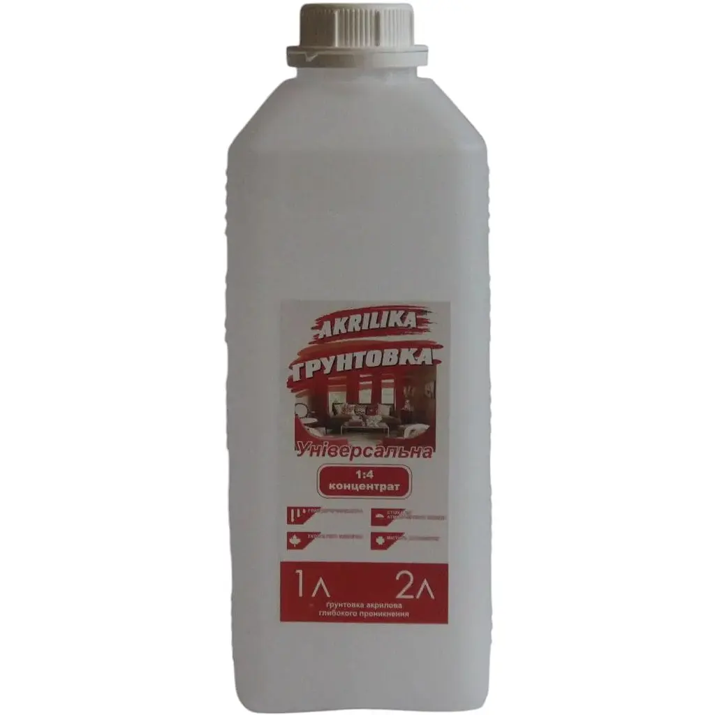 Характеристики. Ґрунтовка універсальна на акриловій основі: глибокопроникна, що закріплює поверхню основи, підвищує адгезію матеріалу до основи, паропроникна, використовується для зовнішніх і внутрішніх робіт.<>>