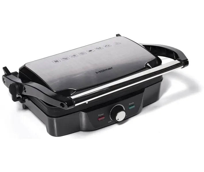 З контактним грилем Hölmer HCG-160 не складно готувати різноманітні м'ясні, овочеві та рибні страви, а також розігрівати пироги, піцу чи сендвічі. При використанні контактного гриля продукти готуються швидко, оскільки вони контактують із плитами одночасно з двох сторін, зберігаючи корисні властивості продуктів. Просто підберіть оптимальну температуру для ідеального прожарювання та виберіть одне з двох робочих положень гриля (кут відкриття конструкції - 105°/180°).