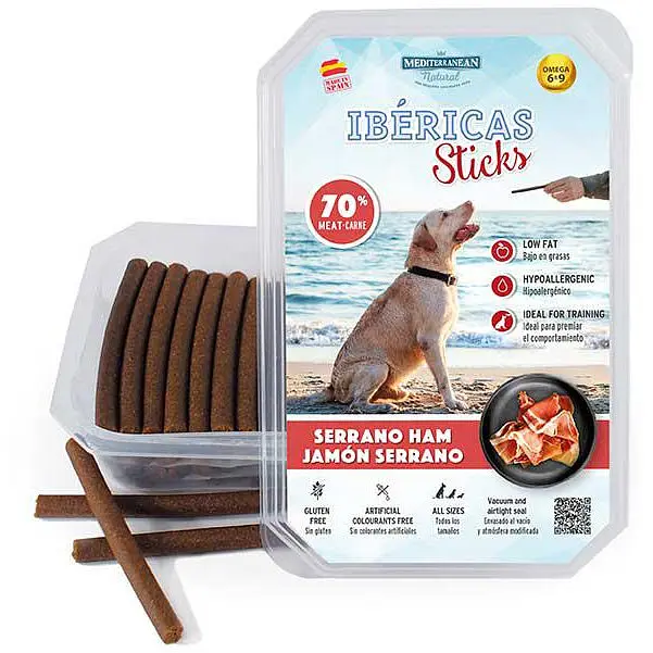 Чудові батончики преміум-класу, що складаються з м'яса, упаковані у вакуумі та в модифікованій атмосфері для збереження аромату та смаку в ідеальному стані. Завдяки своїй якості та різноманітності смаків, вони є найкращою щоденною нагородою для улюбленця, а також ідеальним доповненням до його раціону завдяки вітамінам і мінералам, що містяться в них. Вони не містять глютену, ГМО або трансжирних кислот. Склад: 70% м'яса (мін. 26% шинки серрано), рис, рослинний гліцерин. Добавки: Консерванти: пропіонова кислота, форміат кальцію, лимонна кислота. Харчові добавки: олія материнки. Добова доза: 1-10 кг: до 2 шт. 11-20 кг: до 3 шт. 21-30 кг: до 5 шт. Понад 30 кг: до 6 шт.
