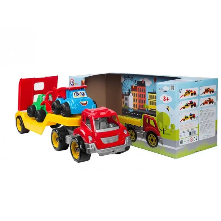 Автовоз - це спеціалізований вантажний автомобіль, спеціально розроблений і використовується для перевезення автомобілів. Цей автовоз перевозить будівельну техніку. Дитині буде цікаво гратися цією іграшкою в пісочниці. З допомогою автовоза можна доставляти машинки на "будмайданчика" для будівництва різних пісочних конструкцій. Машинки з набору будтехніки легко заїжджають на причіп. Граючи з цим набором, дитина розвиває логіку та фантазію і набагато швидше запам'ятовує кольори.
