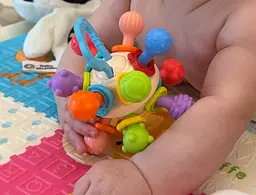 Іграшка класна, Самі гілочки силіконові, добре чухати десна. А ще вона тріщить коли крутиш верхню і нижню частиною. Іграшка яскрава, матеріали підібрані гарні. Можна і крутити і котити.