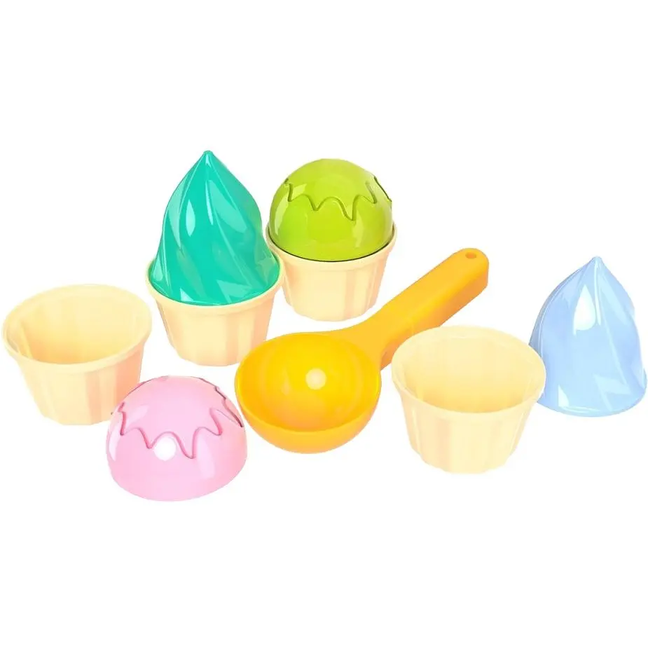 У Наборі для гри з піском - 4 пасочки кремового кольору у формі кексів із вершками та ложка. Вершки до форм різного кольору у вигляді кульки морозива з помадкою і крему.