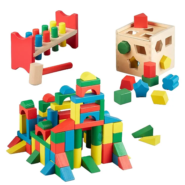 Містить 100 блоків різнокольорової форми, дерев'яний сортувальний куб у формі гірки з 12 великими яскраво забарвленими формами, а також двосторонню лаву з дерев'яним молотком і 8 кілочками.